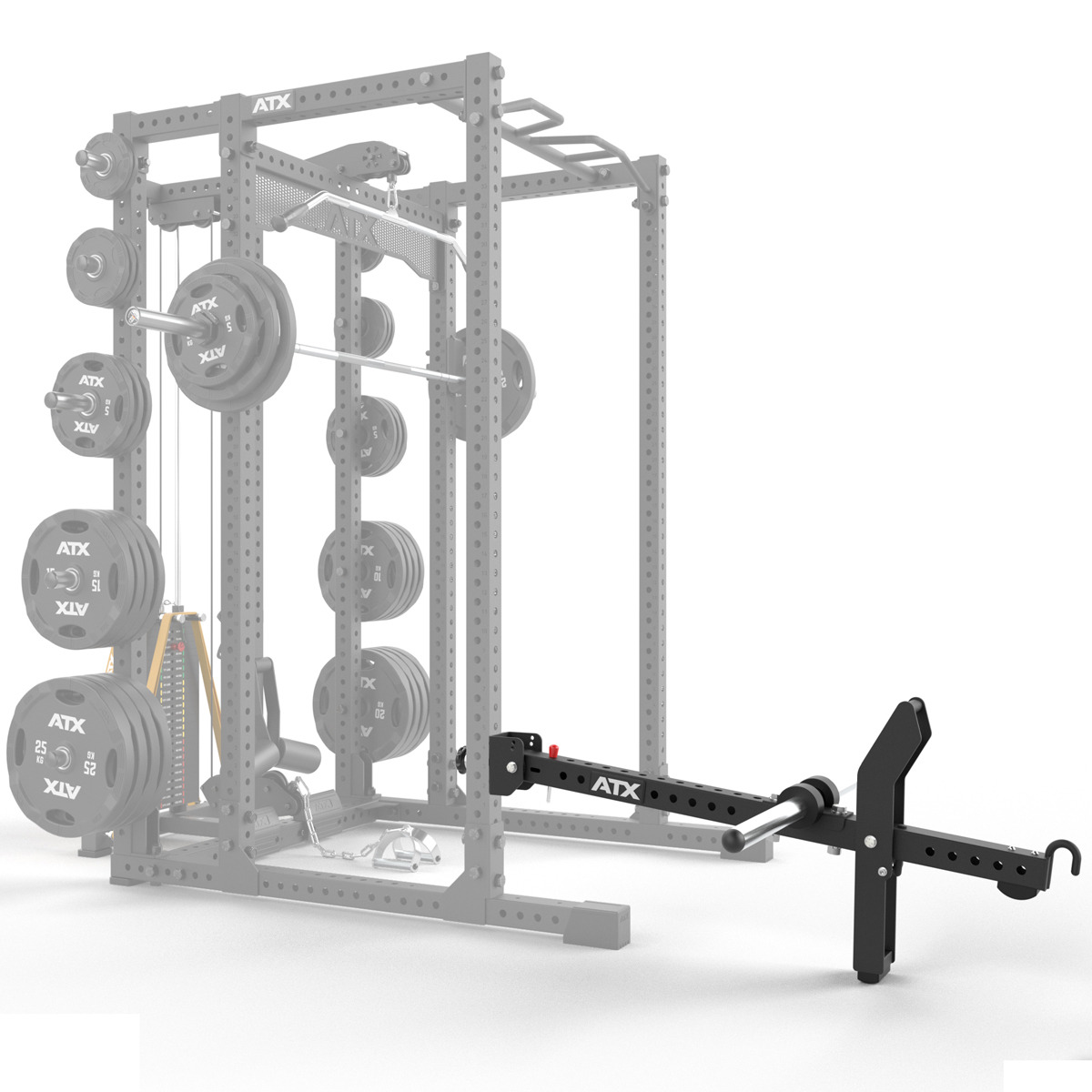 ATX Belt Squat - Anexație pentru genuflexiuni este o soluție eficientă pentru exercițiile de forță la picioare, proiectată pentru a fi rapid și ușor de montat pe toate structurile ATX Rig, precum și pe următoarele modele de cuști de forță din seria ATX: Rig-urile din seria 800, cuști de forță din seriile 600, 700 și 800, și Half Rack-urile din aceleași serii.