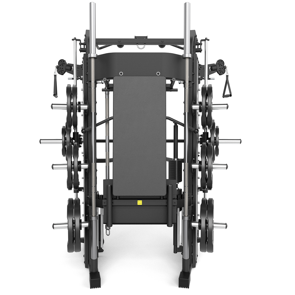 Cu dimensiuni generoase și finisaj de calitate superioară, această stație este ideală pentru sportivii exigenți și antrenamente variate, integrând funcții multiple pentru a răspunde tuturor cerințelor de lucru muscular complet. Suprafața este acoperită prin pulbere neagră mată cu structură fină, oferind nu doar un aspect elegant, ci și o protecție excelentă împotriva uzurii. Echipamentul îndeplinește cerințele de certificare pentru studiouri profesionale conform EN 20957 I.II.IV - S.