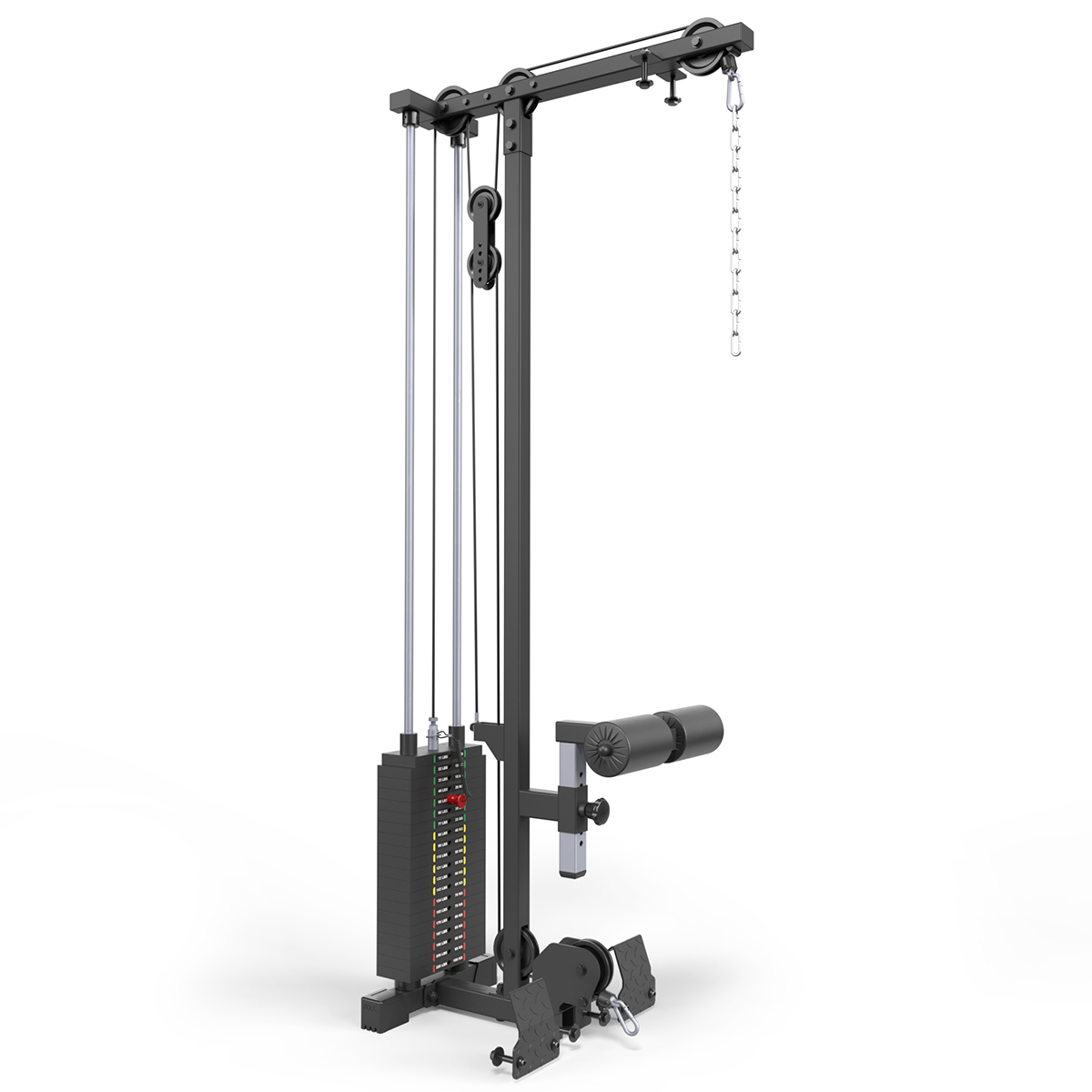 Sistemul include o coloana de greutati cu distributie in trepte de 20 x 5 kg, oferind un total de 100 kg, ceea ce permite o adaptabilitate excelenta la toate nivelurile de antrenament. Dispune de un suport pentru picioare din tabla otelita si un suport pentru genunchi inclus, pentru o pozitionare corecta si confortabila in timpul exercitiilor. Cu o inaltime de 2172 mm, acest dispozitiv maximizeaza spatiul de antrenament, iar cursa cablului de 1610 mm si lungimea totala extinsa de 2030 mm asigura o varietate ampla de exercitii, de la tractiuni verticale la extensii de brate si alte exercitii pentru spate si brate.