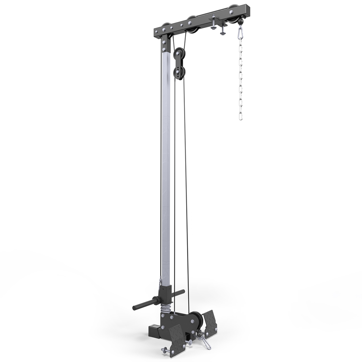Constructia robusta, din otel gros de 60 x 60 x 2 mm, asigura stabilitate si durabilitate excelenta in timp chiar si sub sarcini mari de pana la 140 kg. Acest model este compatibil cu discuri cu diametrul de 30 mm si include suport din otel pentru picioare pentru o pozitie stabila la exercitii. Sistemul dispune de un hub generos de 1610 mm si un streck de 2030 mm pentru miscari ample si controlate. Acoperirea in negru mat fin structureaza finisajul estetic si rezistent la uzura.