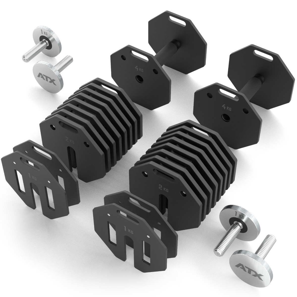 ATX Octa Dumbbells reglabile - set de 2 x 24 kg oferă soluția ideală pentru antrenamente eficiente acasă sau în sala de fitness profesională. Fiecare ganteră are un design octogonal modern și un sistem practic de reglare a greutății, făcându-le potrivite atât pentru începători, cât și pentru sportivi avansați.