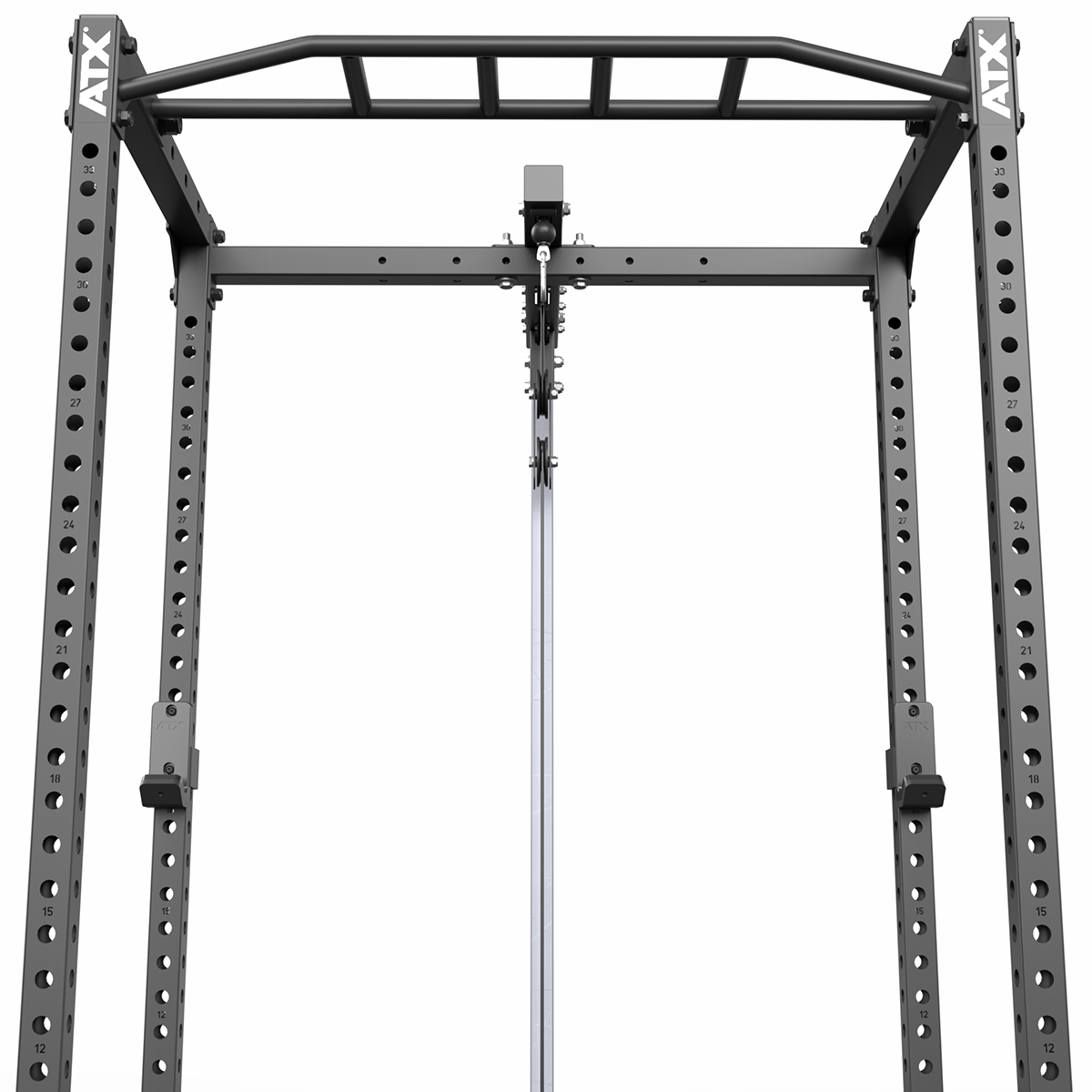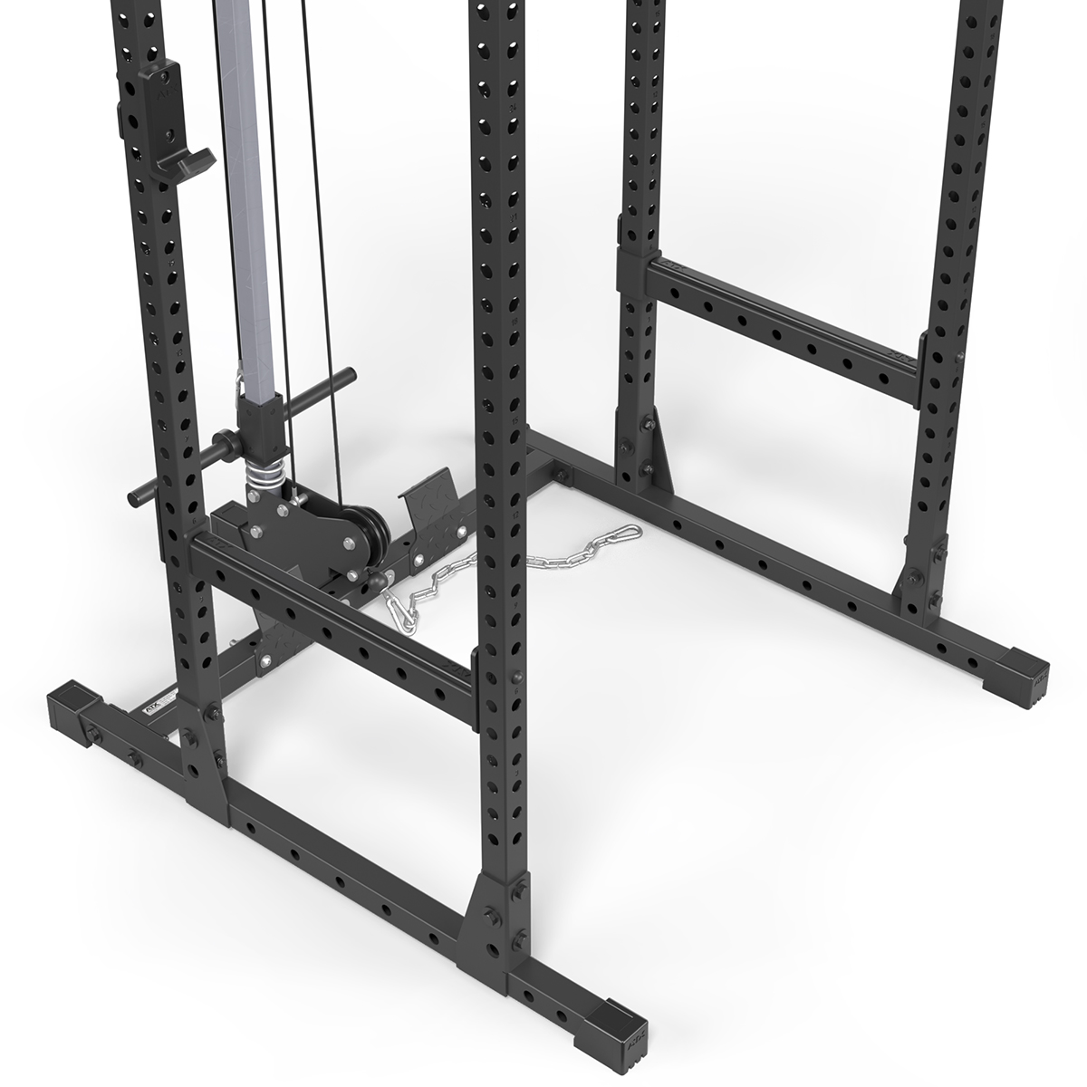 Rack-ul este echipat cu o stație de tracțiune cu încărcare pe plăci, care suportă o greutate maximă de până la 140 kg, extinzând astfel gama de exerciții disponibile pentru utilizator. Lățimea interioară de 108 cm și adâncimea de 60 cm oferă un spațiu suficient de generos pentru o varietate de mișcări. Designul inteligent include 34 de poziții ajustabile cu distanță de 5 cm între ele și cifre gravate cu laser pentru o ajustare rapidă și precisă a barelor.