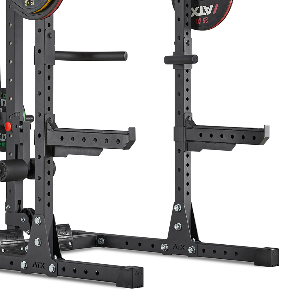 Fiecare braț are o lungime totală de 655 mm, cu o zonă de sprijin eficientă de 540 mm. Dimensiunile compacte (75 mm lățime și 21 mm înălțime) și greutatea de 10 kg per pereche asigură stabilitate pe toată durata antrenamentului. Suprafața este acoperită cu un strat de pulbere neagră, cu textură fină, ce oferă rezistență sporită la zgâriere și uzură. ATX® Safety Spotter Arms sunt certificate conform standardului EN 20957 I.II.IV-S, oferind siguranță și durabilitate de top, și beneficiază de o garanție de 3 ani din partea producătorului.
