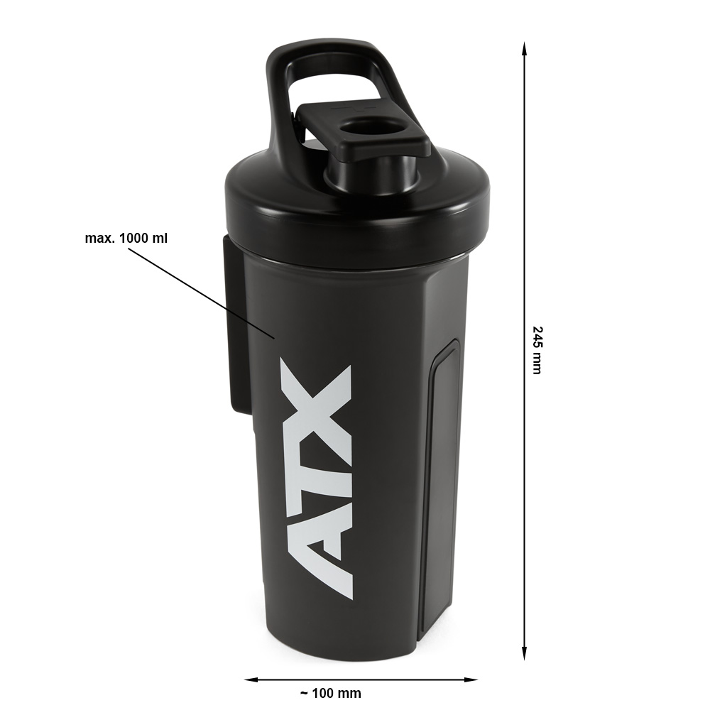 Acest shaker robust este confecționat din material plastic rezistent, având un design modern, culoare neagră, și este prevăzut cu un suport magnetic practic, ceea ce îl face ușor de atașat la suprafețe metalice pentru a-l avea mereu la îndemână în sala de sport sau acasă. Cu o capacitate generoasă de 1000 ml, shakerul ATX® permite amestecarea perfectă a ingredientelor, prevenind scurgerile, datorită capacului sigur și sistemului de închidere ermetică.