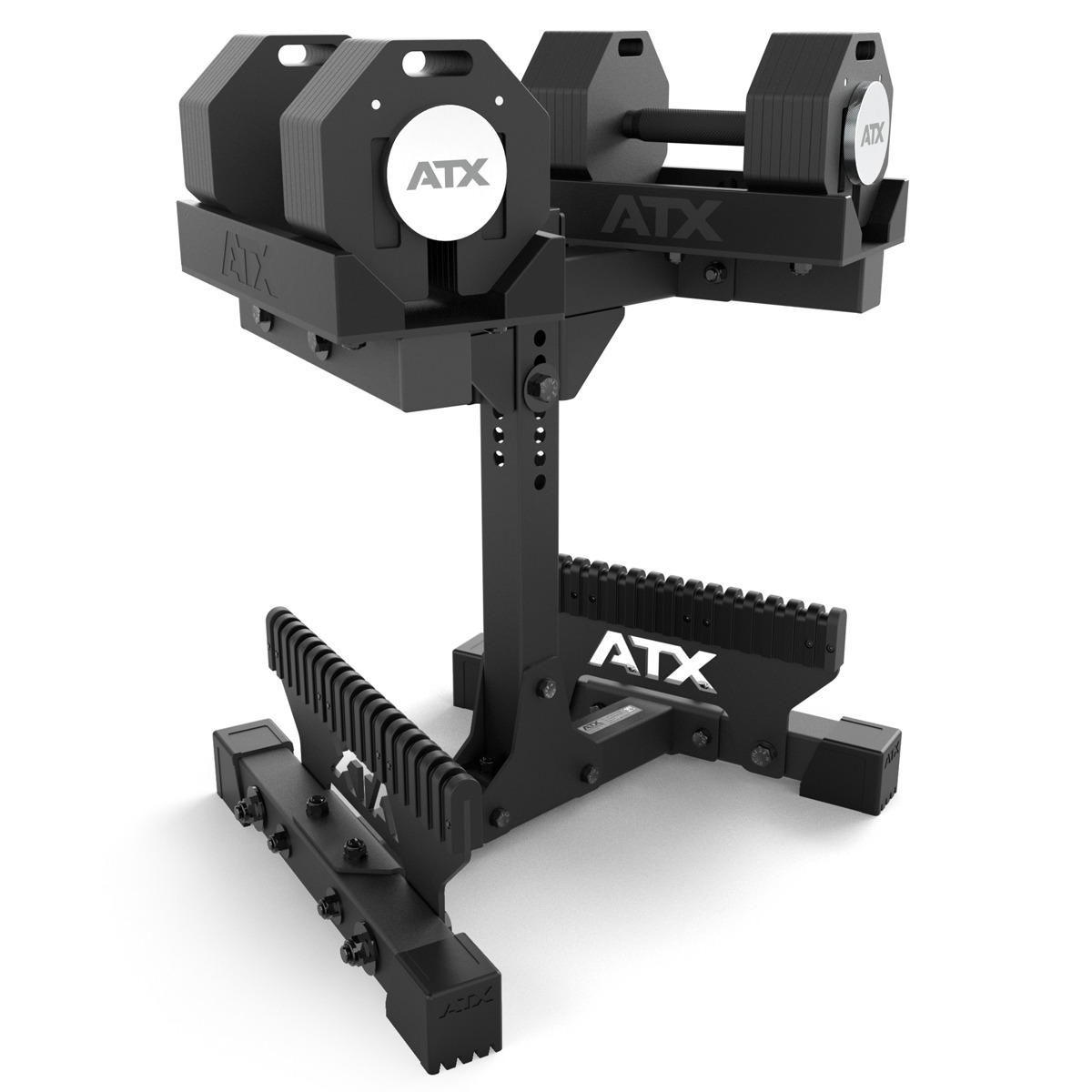 ATX Suport reglabil pentru gantere - M este un suport profesional proiectat special pentru depozitarea și organizarea ganterelor reglabile ATX, asigurând o stabilitate excepțională și acces facil la echipamentele utilizate la antrenamente.