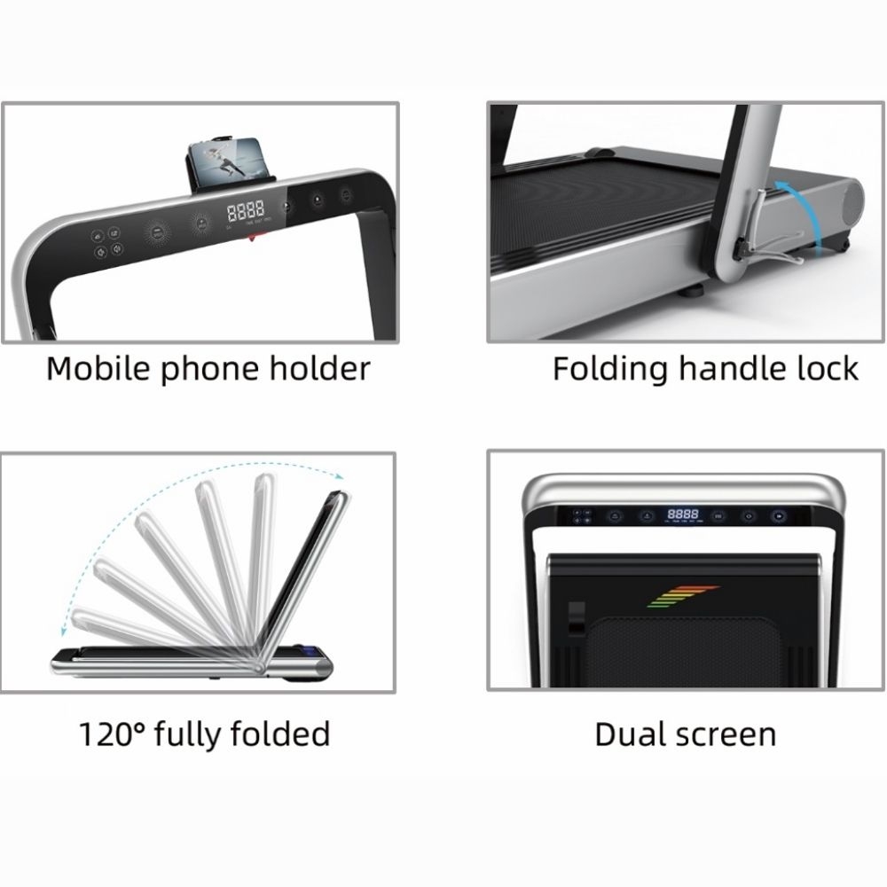 Aceasta banda de alergat este dotata cu un motor silentios, deci va puteti antrena in timp ce membrii familiei dorm. Puteti asculta muzica sau vorbi la telefon in timp ce va antrenati, banda este dotata cu suport pentru dispozitive mobile. In plus va protejeaza picioarele deoarece este construita in 6 straturi: covor anti-frecare, covor anti-zgomot, covor pentru rezistenta, covor de spuma pentru reducere a socurilor, covor de intarire contravântuire, covor Trelon. Consola principala are butoane ce pot fi accesate prin touch screen, simplu si rapid. Opriti si porniti rapid banda de alergat prin butoanele Start/ Stop, intrerupeti putin antrenamentul prin butonul Pause/ Continue, reduceti sau cresteti treptat viteza cu 0.1km/ora prin butoanele de +/- sau selectati viteza prestabilita de 6 sau 12 km/ora prin apasarea lunga a butoanelor 6 respectiv 12 din dotare.