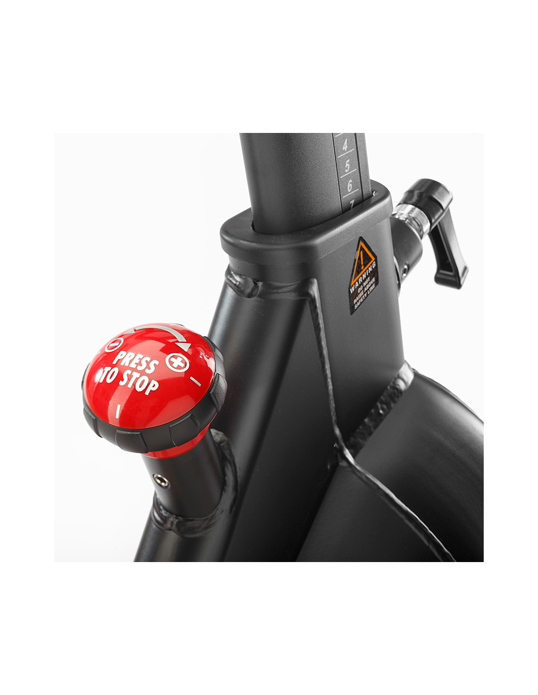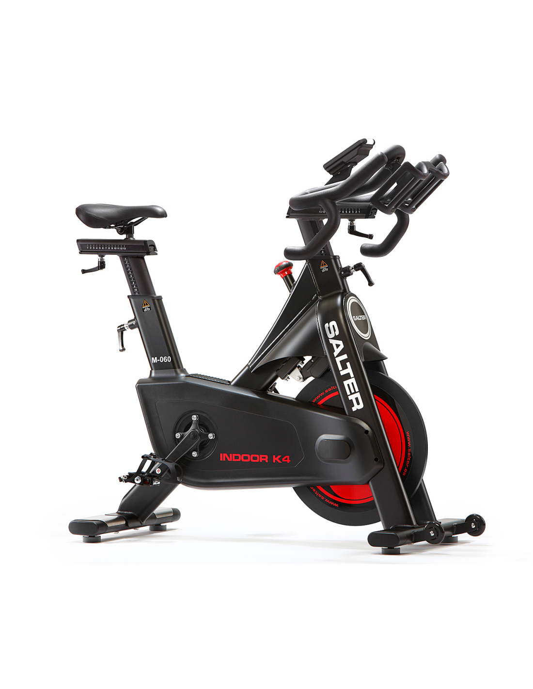 Bicicleta Spinning de Interior K4 de la Salter – aparatul comercial de oțel ranforsat, cu sistem de frânare magnetic cu 32 de poziții, volan de 20 kg, monitor iluminat cu funcții avansate (puls, wați, RPM) și conectivitate Bluetooth prin aplicația GroupCycling pentru antrenamente interactive. Suportă utilizatori până la 180 kg și este gândită pentru utilizare profesională.