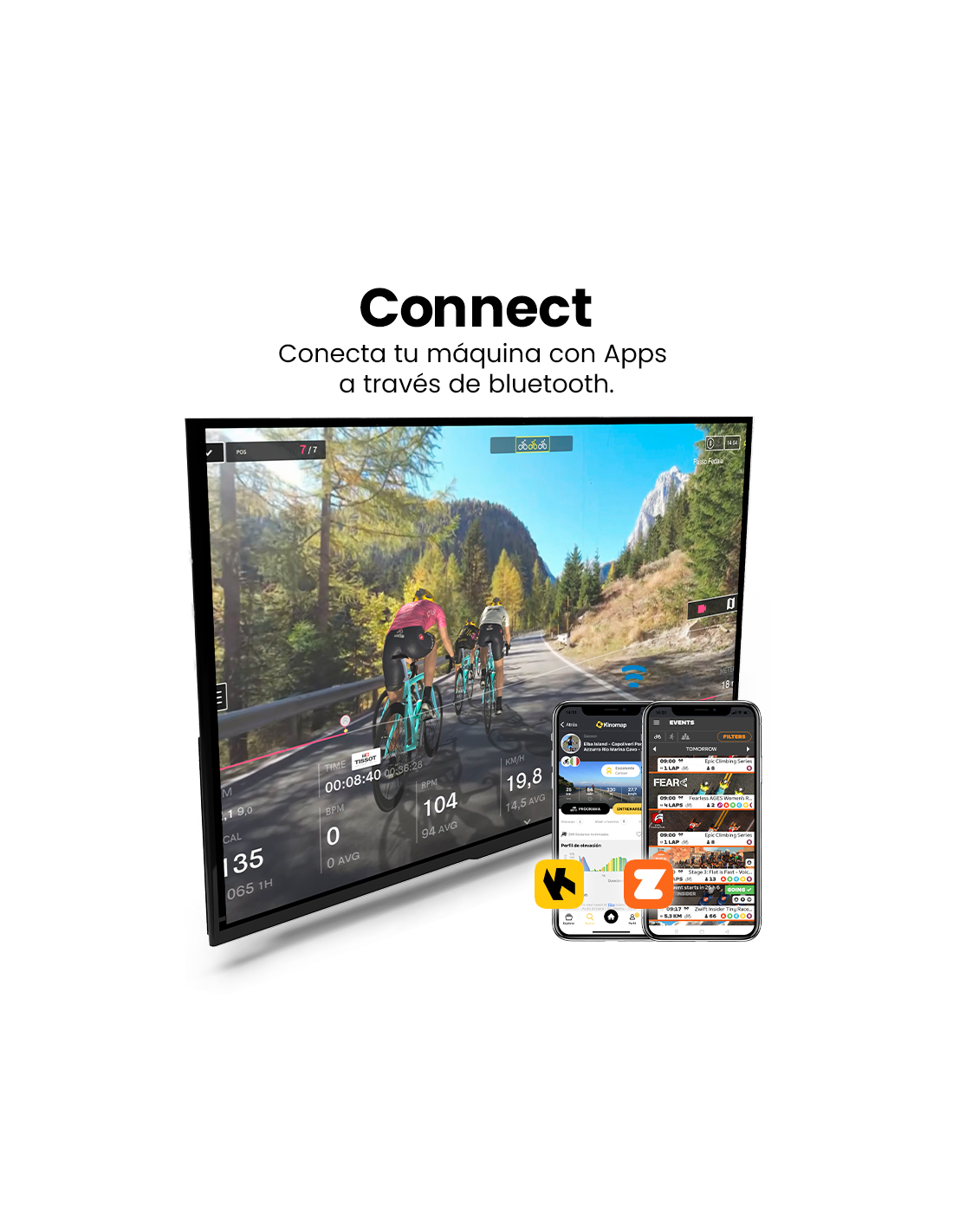 - Conexiune Bluetooth care permite trimiterea datelor de putere (WATT) și RPM către aplicațiile dvs. preferate, cum ar fi KINOMAP și ZWIFT. În plus, puteți utiliza și o centură cardiacă pentru a trimite toate datele către APP-uri și a vedea mai multe detalii despre antrenamentul dumneavoastră.