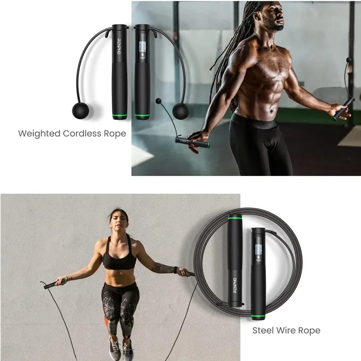 Bucură-te de antrenamentele tale oriunde cu coarda inteligentă RENPHO 2 în 1. Poți folosi coarda clasic pentru exterior sau poți trece la sărit fără fir cu coarda inclusă cu greutăți, atunci când spațiul este restrâns. Aceasta oferă senzația reală a săriturilor cu coarda, fără fir conectat.