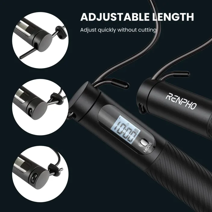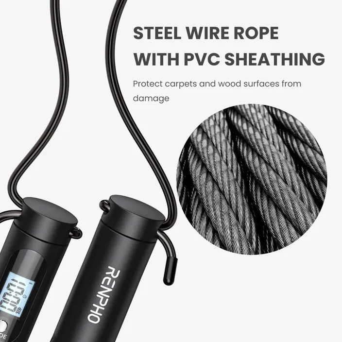 Coarda digitală RENPHO este echipată cu mâner cu greutate și acoperire din silicon, confortabil și stabil în timpul exercițiilor.
