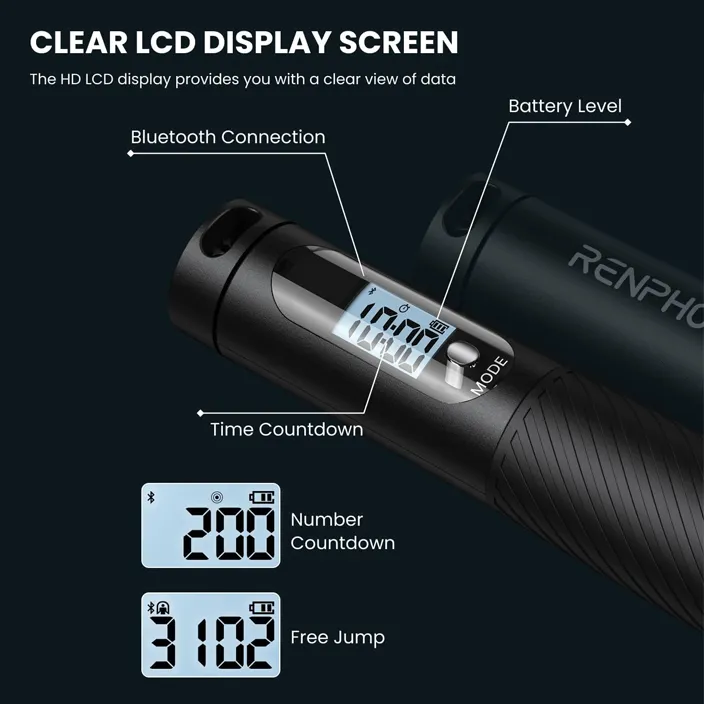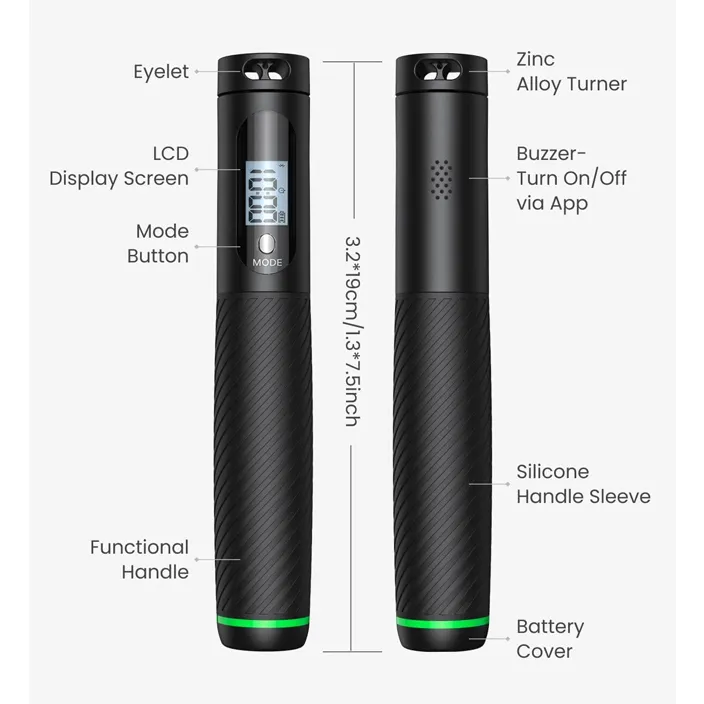 Mânerul include un display LCD care afișează clar datele săriturilor. Apasă butonul pentru a seta obiectivul de antrenament și începe-ți sesiunea imediat.