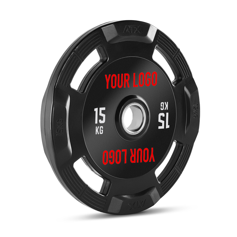 Disc cauciucat cu maner tip gripper pentru antrenament de forta si fitness, diametrul 50,8 mm, greutate 15 kg, personalizabil cu logo client.