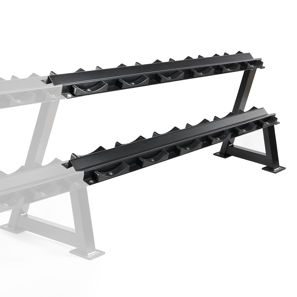 Acest suport pentru gantere, dotat cu douăsprezece tăvi de depozitare, poate fi extins la orice lungime. Prin construcția sa, raftul se remarcă printr-o calitate extraordinară a execuției și o stabilitate excelentă. Jgheaburile cu două niveluri asigură depozitarea sigură și stabilă a ganterelor, fără riscul de alunecare. Un modul poate susține douăsprezece gantere, iar la fiecare extensie suplimentară se adaugă un picior de sprijin suplimentar.