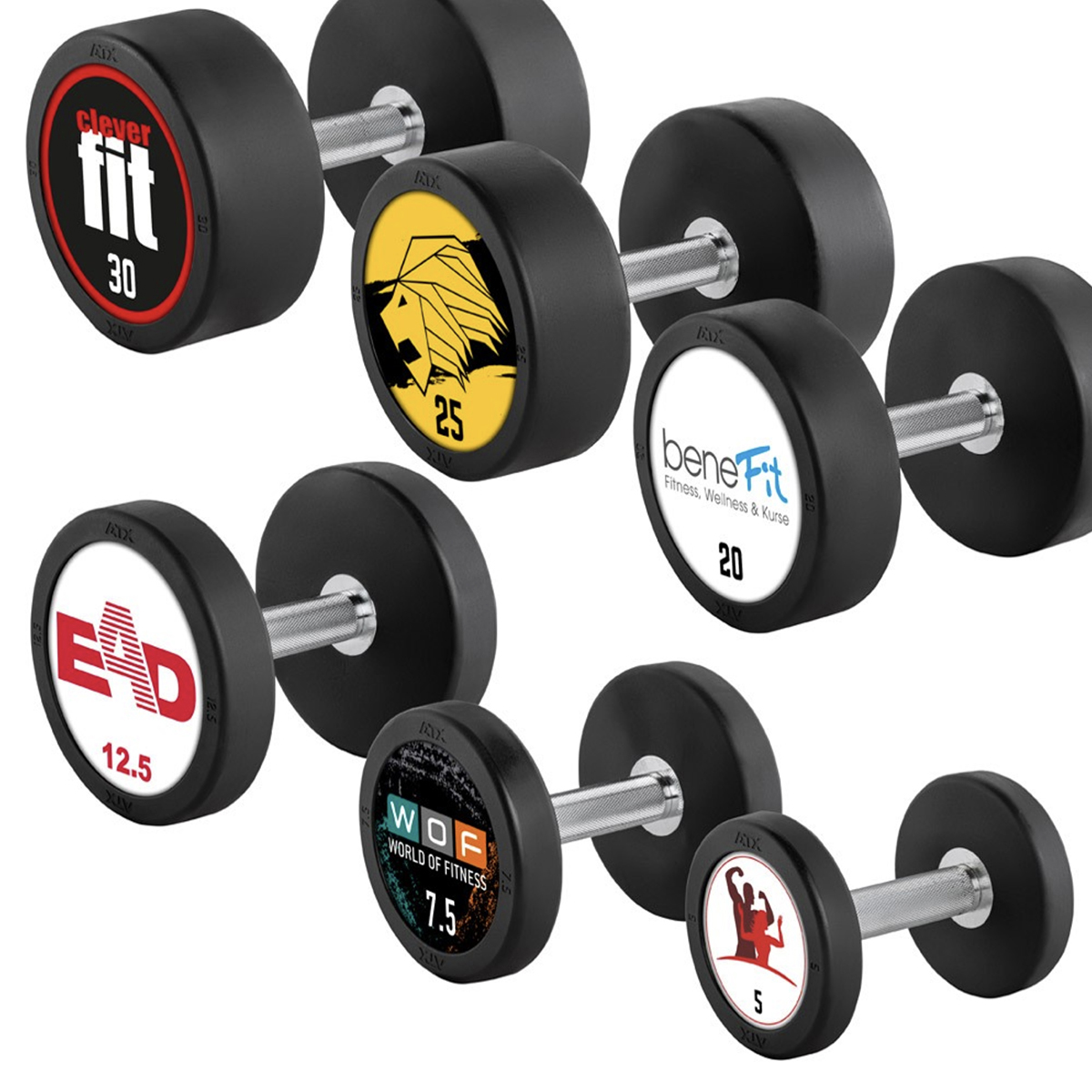 Gantera cauciucata profesionala de 45.0 kg, din otel masiv, acoperita cu cauciuc, personalizabila cu logo, ideala pentru antrenamente intense in sali de fitness.