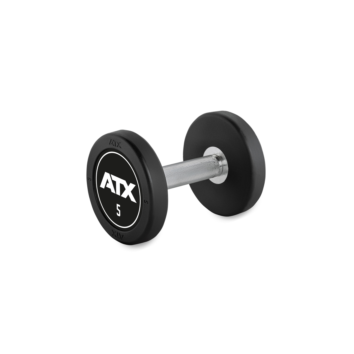 Are un design modern cu finisaj negru, completat de logo-ul ATX și de indicația greutății imprimate în alb, oferind un aspect elegant și profesional. Mânerul cromat oferă o prindere confortabilă și sigură, având un diametru de 32 mm pentru a se potrivi perfect în mână. Dimensiunea totală a mânerului este de 143 mm, făcând această ganteră ușor de folosit atât pentru exerciții individuale, cât și pentru antrenamente de grup.