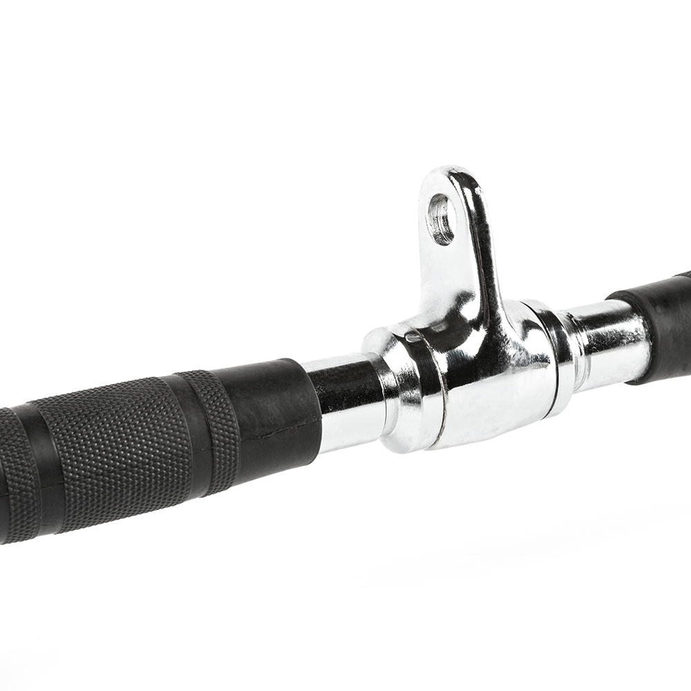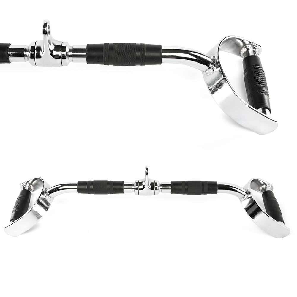 Bara prezintă o construcție robustă din oțel masiv și este cromată lucios pentru durabilitate crescută și o estetică modernă. Designul său unghiular permite un traseu mai adânc în exerciții, activând mai mult musculatura dorită. Este dotată cu un sistem de îmbinare rotativă pentru o funcționare fluidă și o greutate totală de aproximativ 3,5 kg, perfectă pentru utilizarea intensivă în săli de sport profesionale sau acasă.