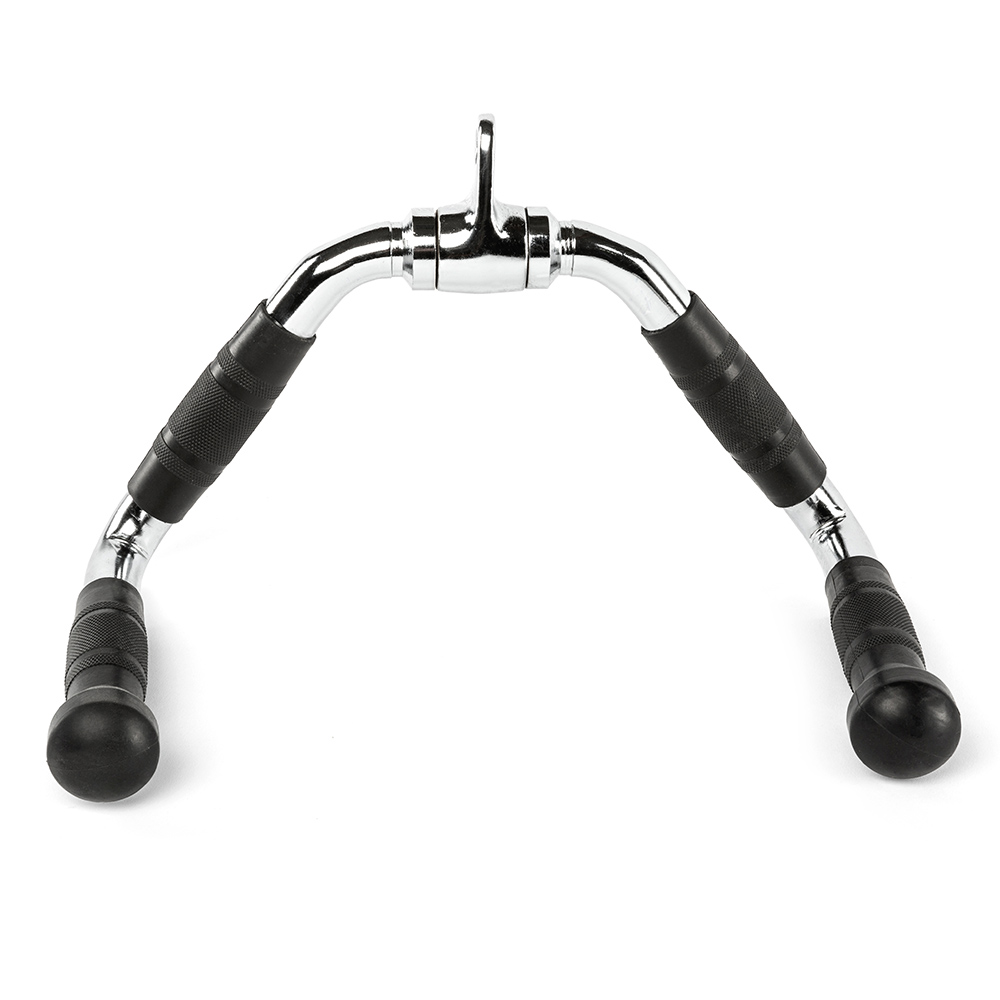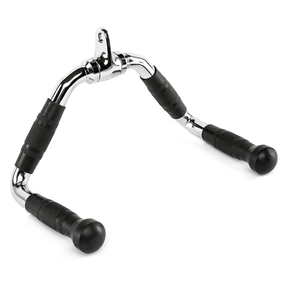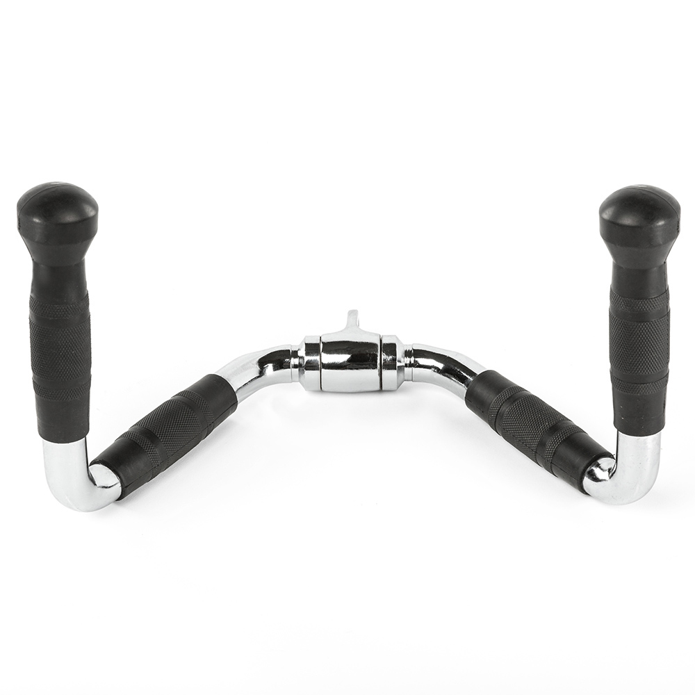 Cu o latime de prindere de aproximativ 35 cm, acest maner este construit din otel masiv, avand un sistem cu articulatie de rotatie pentru o libertate totala de miscare si versatilitate. Suprafata este cromata lucios, oferind atat rezistenta la coroziune, cat si un aspect elegant. Forma usor inclinata a manerelor permite utilizarea eficienta atat pentru exercitii de vaslit cat si pentru impins triceps, adaptandu-se diverselor rutine de antrenament.