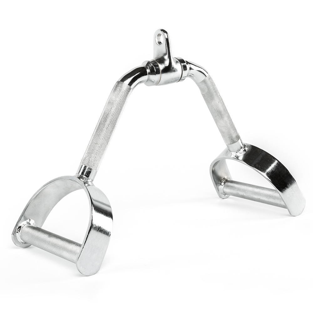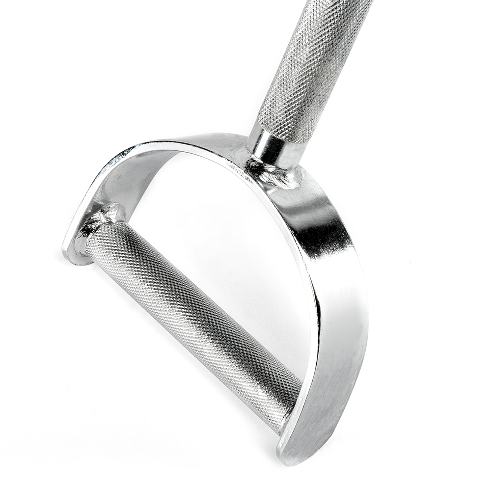 Realizat integral din oțel solid, lucios și cromat, acest mâner este dotat cu un mecanism de rotație care permite o mișcare naturală a încheieturilor, evitând solicitările suplimentare. Zona de prindere este prevăzută cu striații antiderapante pentru o aderență sigură și confortabilă. Distanța dintre mânere este de aproximativ 40 cm, potrivită pentru o varietate de exerciții și poziții de antrenament.