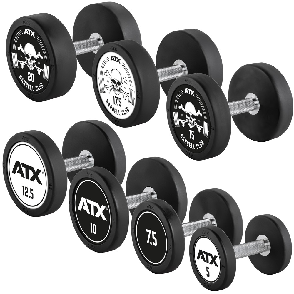 Set de gantere cauciucate PRO-Style de la ATX, greutăți de la 5 la 20 kg, cu mâner ergonomic, realizate din oțel acoperit cu cauciuc pentru o rezistență crescută și protecție la impact.