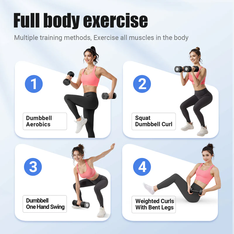 Acest set de 2 gantere compacte este mic și portabil. Poate fi folosit pentru antrenamentul zilnic de acasă, de la biroul de gimnastică. Un număr diferit de combinații de greutăți cu gantere, cu diferite mișcări de antrenament, pot realiza un exercițiu pentru întregul corp.