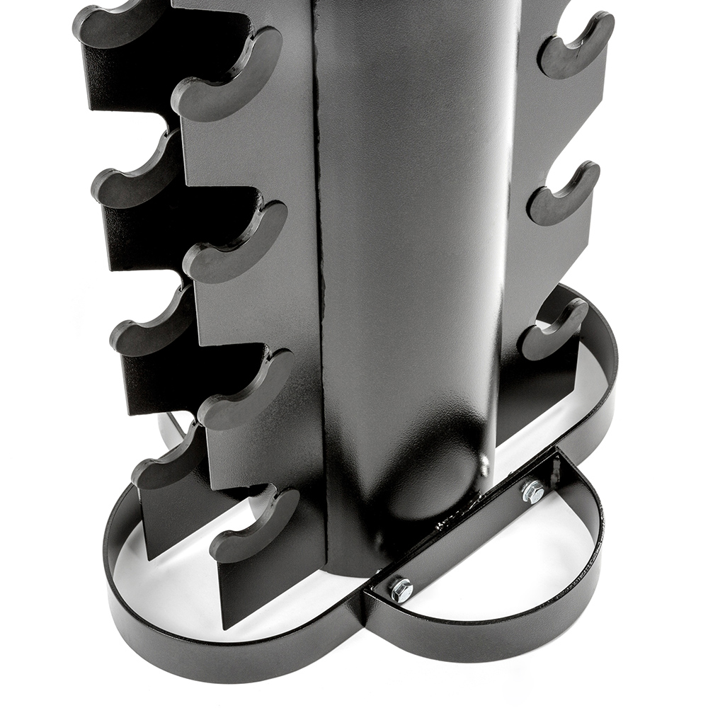 Datorită construcției sale solide și finisajului de calitate, stativul asigură stabilitate și durabilitate chiar și în medii de utilizare intensă. Culoarea neagră conferă un aspect modern și elegant, potrivit pentru orice tip de sală de sport sau spațiu de antrenament. Dimensiunile compacte și designul ergonomic îl fac ușor de integrat chiar și în spații mai mici, fără a compromite capacitatea de depozitare.