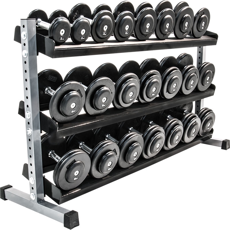 Acest raft cu 3 nivele pentru gantere oferă o soluție profesională și sigură pentru depozitarea ganterelor. Sistemul modular permite montarea individuală a celor 3 polițe la înălțimea dorită, pentru optimizarea ergonomiei de utilizare. Polițele sunt prevăzute cu suprafețe de protecție cauciucate pentru a preveni deteriorarea greutăților și a raftului.