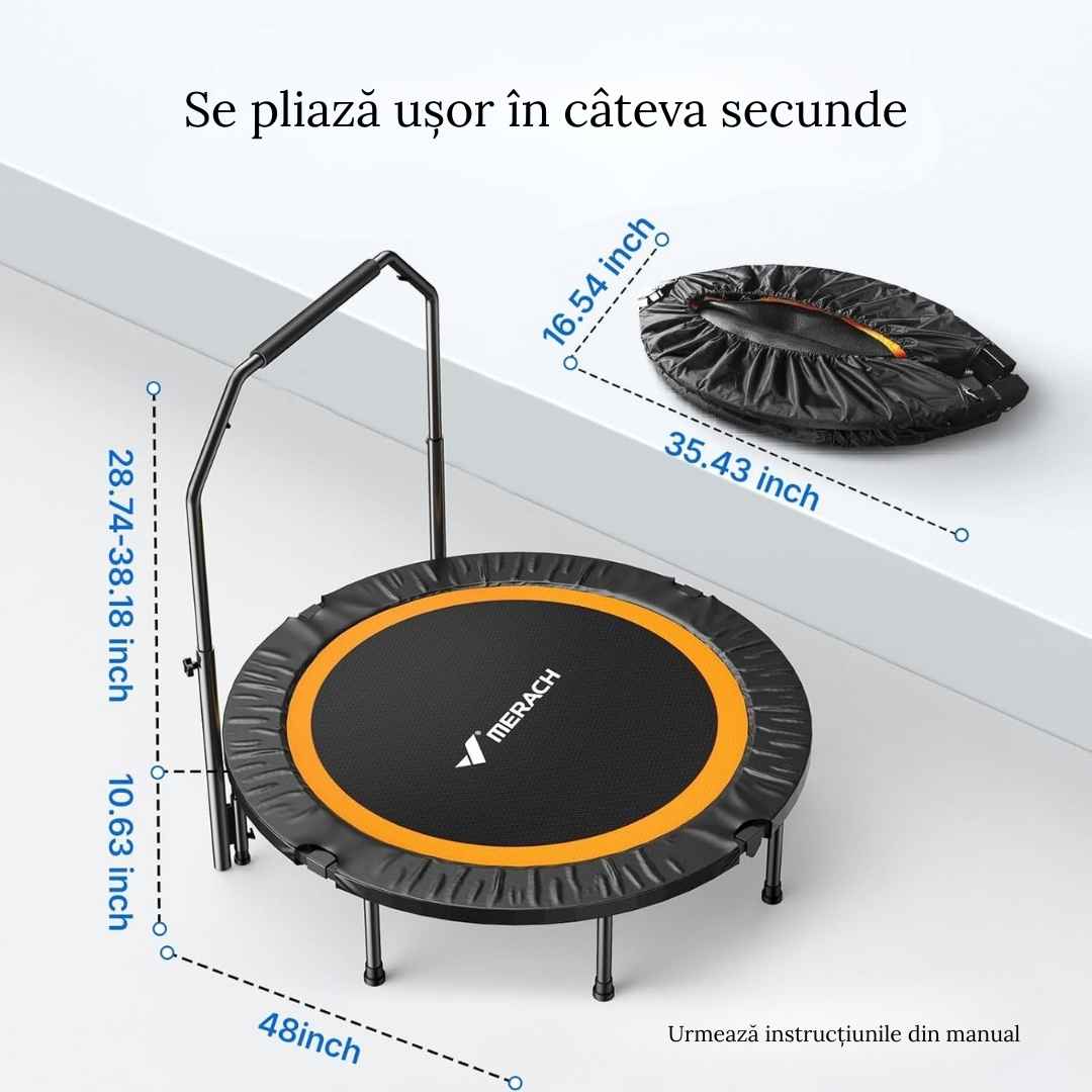 PLIABILĂ ȘI ECONOMISITOARE DE SPAȚIU - Când nu aveți nevoie să utilizați sau să transportați trambulina de fitness pentru adulți, aceasta poate fi pliată cu ușurință în câțiva pași simpli. Când este pliată, poate fi depozitată convenabil într-un colț, în portbagajul mașinii sau lângă un dulap, cu condiția să existe suficient spațiu pentru depozitare când este pliată. Asamblarea acestei mici trambuline este o joacă de copii și durează doar câteva minute.